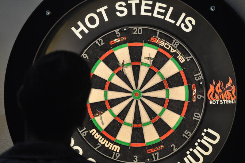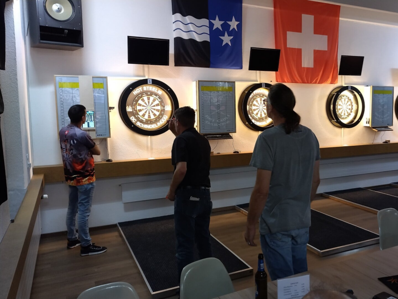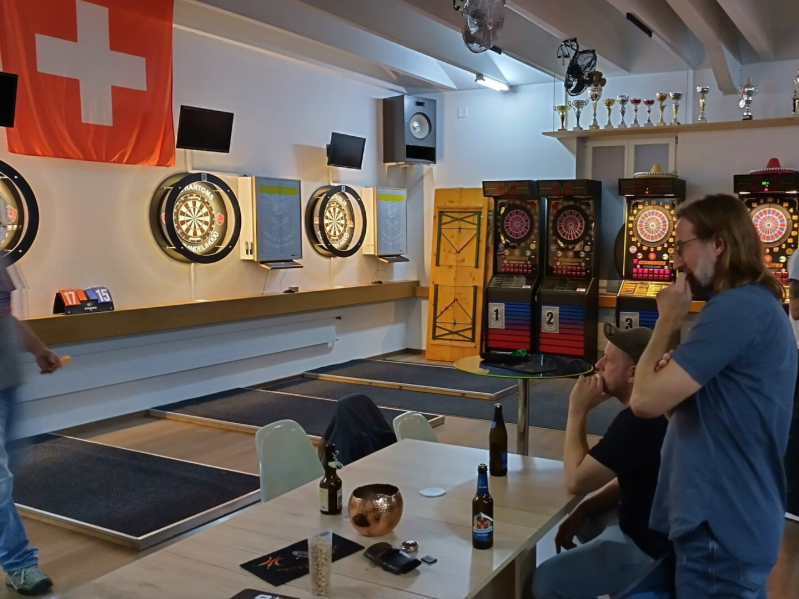 Im Schindeli, dem Darts-Lokal in Rupperswil, startet soeben die Partie zwischen den Hot Steelis und dem DC Sonnenberg. Das Lokal ist zusammen mit dem Brugger Dampfschiff das grösste im Kanton. Allerdings mit dem Unterschied, dass hier auch E-Darts gespielt wird. Es herrscht auch etwas mehr Betrieb als in Brugg. An den E-Darts-Automaten spielt ein kleines Grüppchen und an der Bar stehen ein paar Leute mit Blick auf die Leinwand. Es läuft der Grand Slam of Darts. Das Spiel der DLRA gerät fast ein wenig in den Hintergrund. Ein möglicher Grund ist die Ausgangslage: Das Heimteam ist ungeschlagen Erster, während die Gäste bisher noch keinen einzigen Punkt geholt haben. Entsprechend verspricht die Partie wenig Spannung.