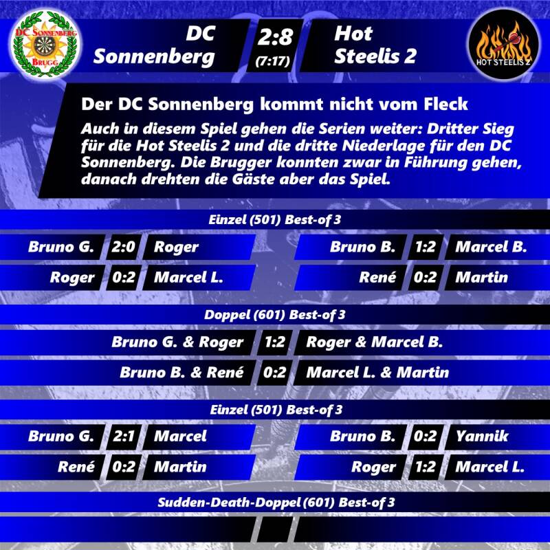 Die Vorschau auf dieses Spiel lautete «Blitzstart vs. Fehlstart». Die beiden Teams starteten komplett unterschiedlich in die Saison: Das Heimteam mit zwei Siegen, die Gäste mit zwei Niederlagen. An diesem dritten Spieltag zeichnete sich schon früh ab, dass es – zumindest für den Moment – in diesem Stil weitergehen wird. Die Brugger Steelis konnten die ersten vier Einzelpartien allesamt gewinnen. Auch wenn die Gäste in drei der vier Partien ein drittes Leg erzwingen konnten, stand es danach unter dem Strich 4:0.