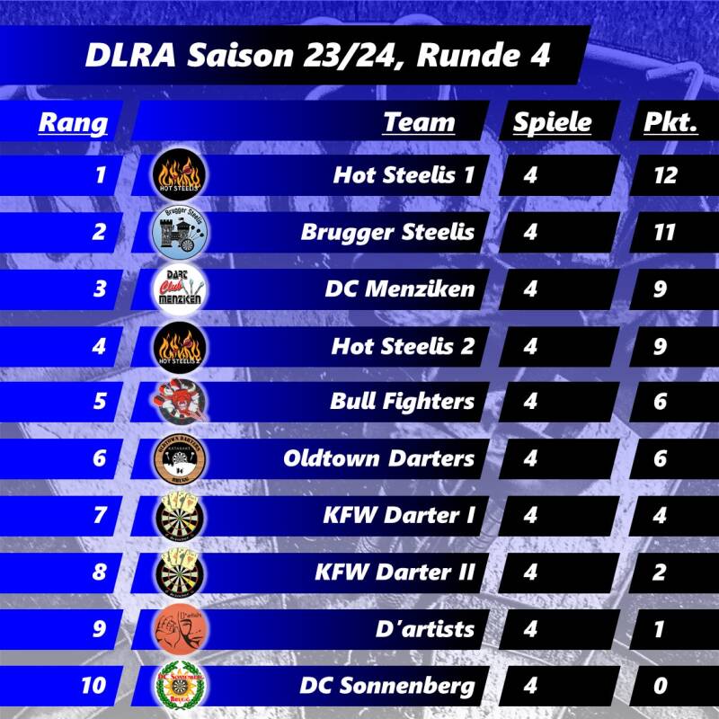 Im Nachtragspiel der vierten Runde gewinnen die KFW Darter I zuhause gegen den DC Sonnenberg. Für die Gränicher ist es der erste Sieg der Saison, um den sie aber lange bangen mussten. Nach einem guten Start und einer 3:0 Führung konnten die Gäste aus Brugg das Spiel plötzlich drehen. Der DC Sonnenberg gewann beide Doppel-Partien und glich zum 3:3 aus. Der zweite Einzelblock startete dann mit je einem Sieg, bevor die Heimmannschaft dann die letzten beiden Partien für sich entscheiden konnte und mit 6:4 gewann. Die KFW Darter I ziehen damit in der Tabelle an ihrer zweiten Mannschaft vorbei, während der DC Sonnenberg – als nunmehr einziges Team ohne Punkte – am Tabellenende stehen bleibt.