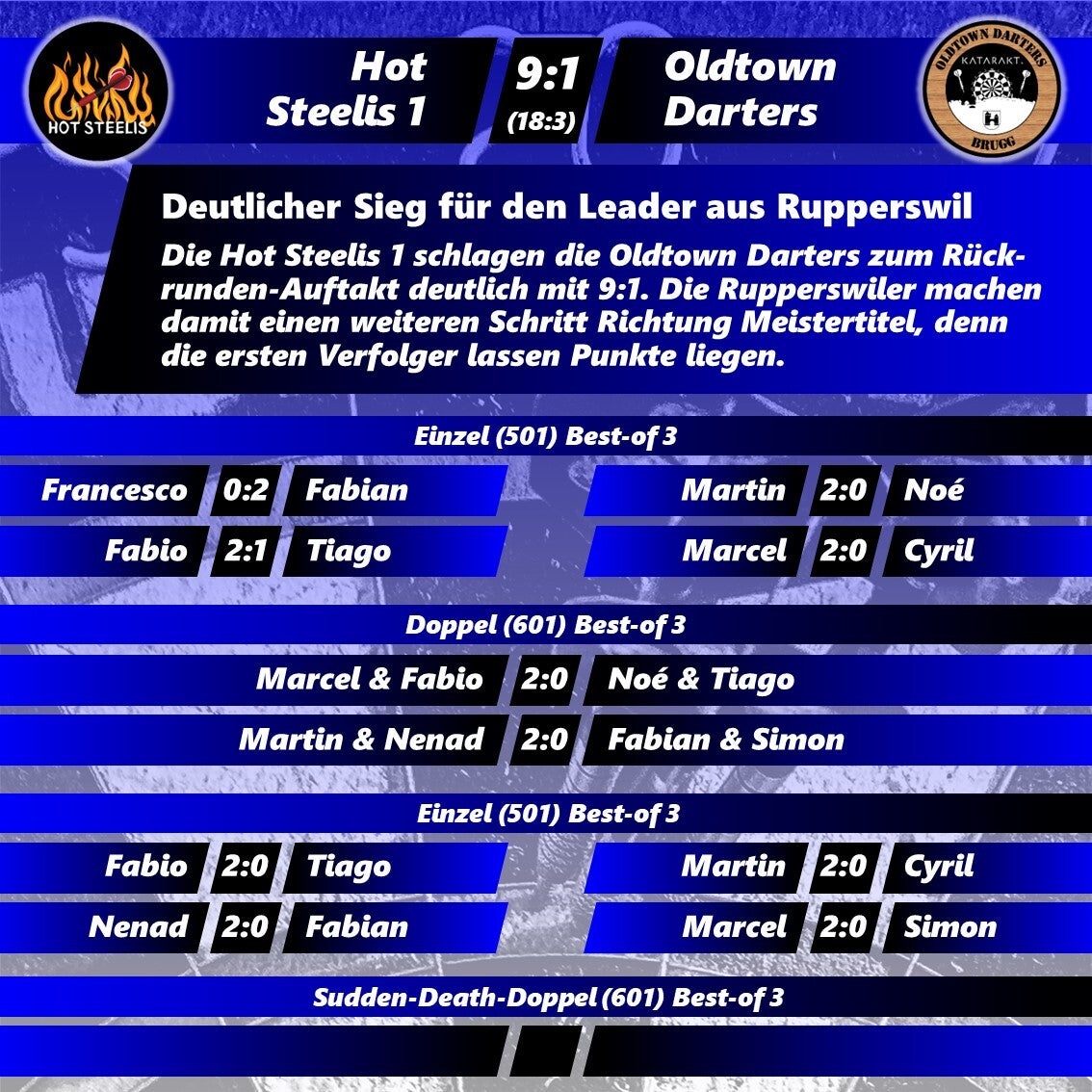 Die zweite eindeutige Partie des Abends fand in Rupperswil statt. Dort bezwangen die Hot Steelis 1 - nach wie vor ungeschlagener Leader - die Oldtown Darters mit 9:1. Für die Brugger ist es die höchste Saison-Niederlage bisher, aufgrund der Ausgangslage aber verkraftbar.