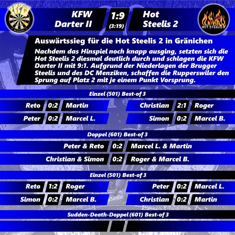 Dank dieses Sieges und der gleichzeitigen Niederlagen des DC Menziken und der Brugger Steelis konnten die Hot Steelis 2 wieder auf den zweiten Platz vorrücken. Die KFW Darter II verbleiben dagegen mit drei Punkten auf dem zweitletzten Rang.