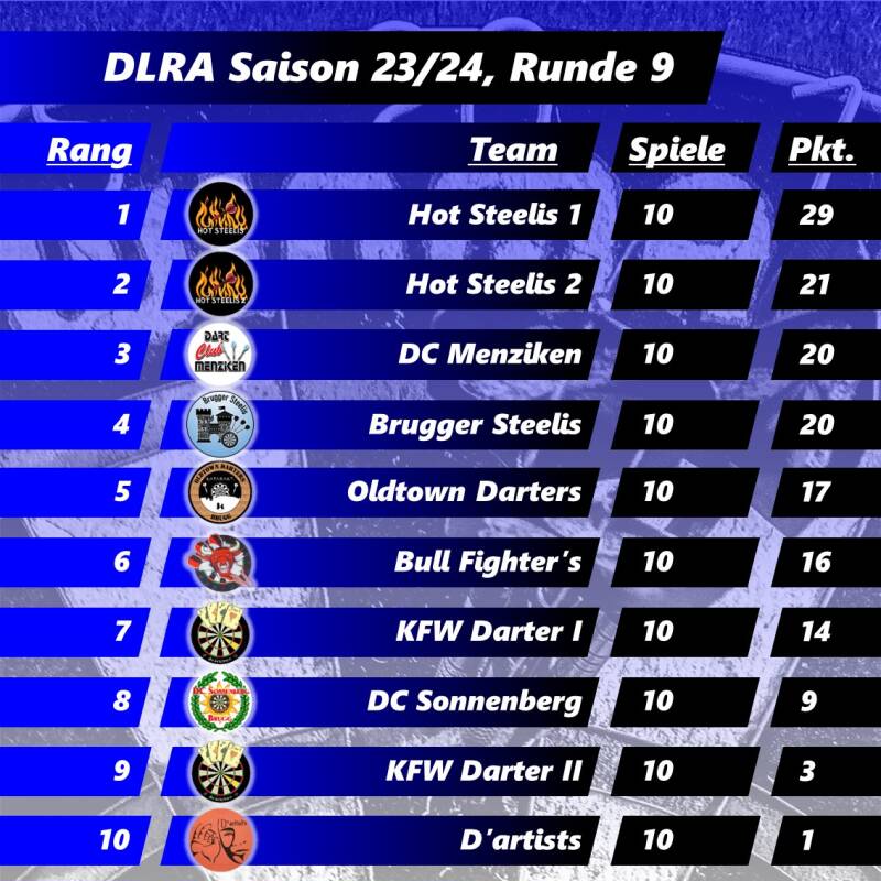 Mit der 10. Runde der aktuellen Saison wurde die Rückrunde eröffnet. Wie schon in der Hinrunde gab es drei ziemlich klare Resultate und zwei ziemlich knappe, die jeweils mit 6:4 endeten. Einziger Unterschied: die knappen Spiele waren noch etwas enger und mussten beide in der Verlängerung entschieden werden. Und: Bei beiden knappen Spielen siegte jeweils der Aussenseiter! Der DC Menziken und die Brugger Steelis - bis anhin auf Platz 2 und 3 - verloren ihre Spiele etwas überraschend gegen den DC Sonnenberg und die KFW Darter I.