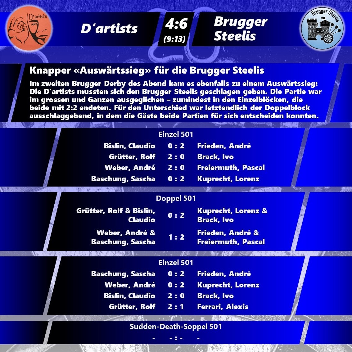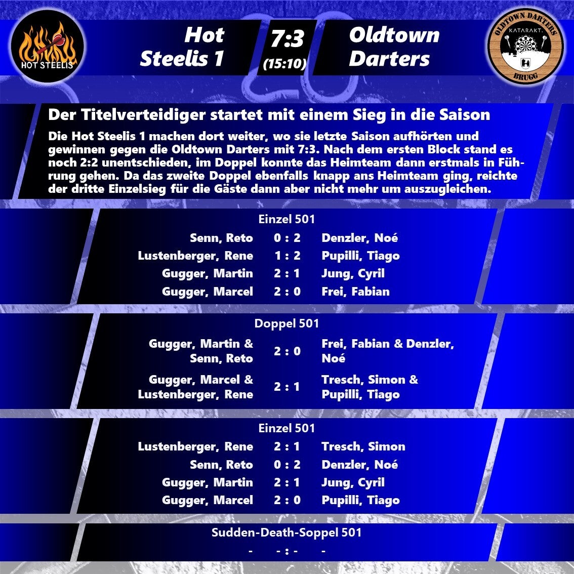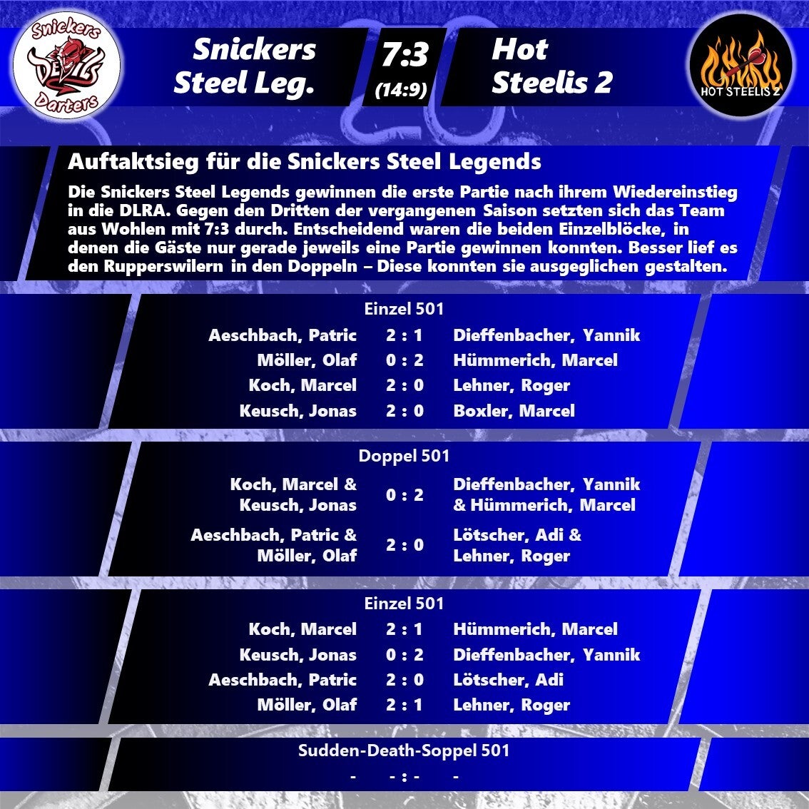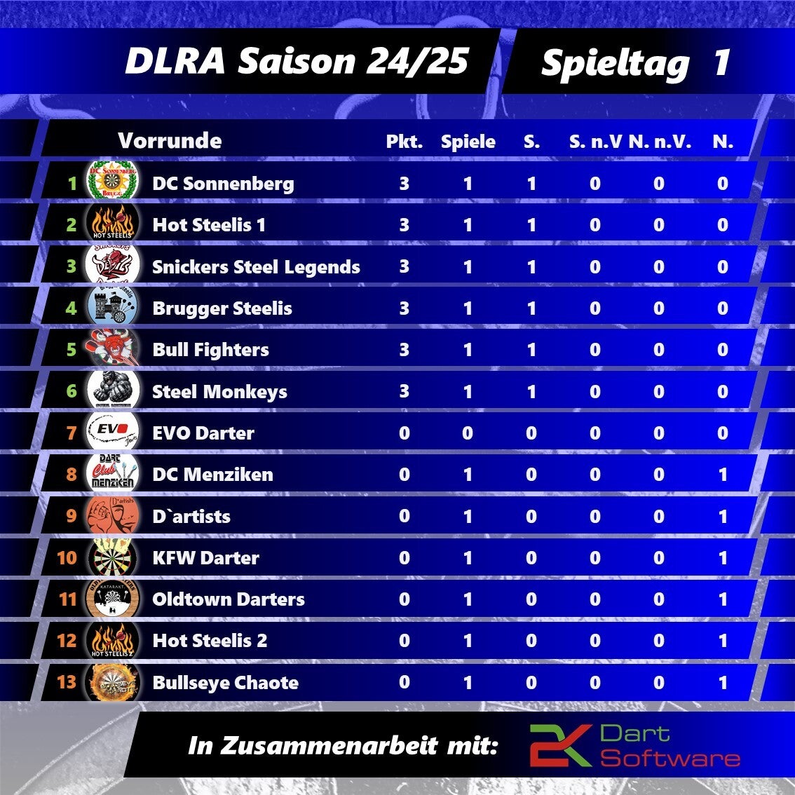 Die neue Saison startete gut und es gab bereits einige Highlights: fünf 180er, vier Short-Games und vier High-Finishs - das ist ein guter Anfang und macht Freude auf mehr. Genauso erfreulich ist aber auch die Tatsache, dass es trotz Migration der 2K-Dartsoftware keinerlei Schwierigkeiten gab und die Spiele reibungslos abliefen.