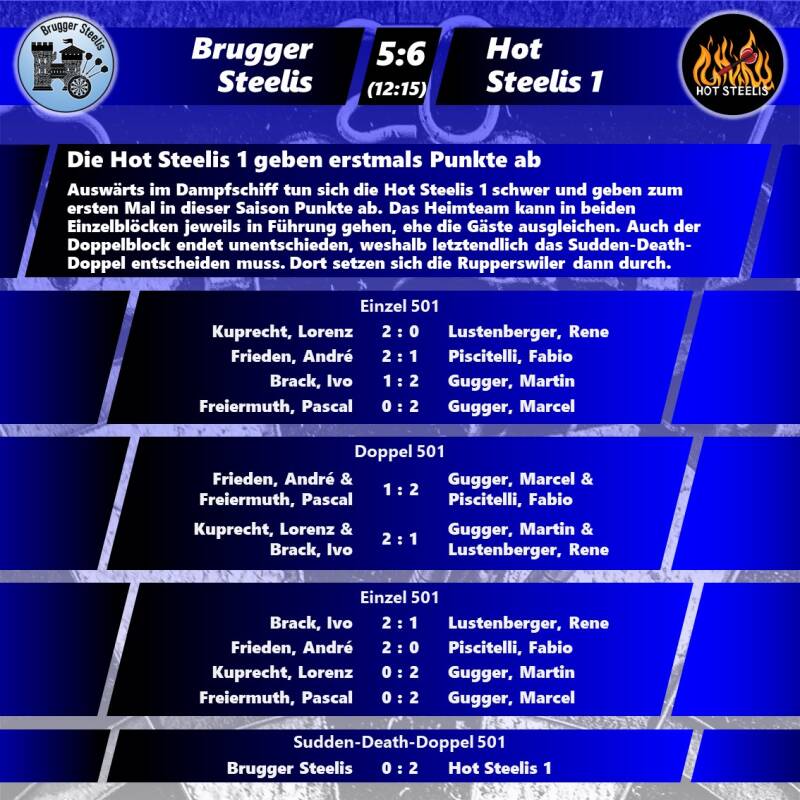 Der achte Spieltag war geprägt von zwei äusserst knappen Spielen, die im Sudden Death Doppel entschieden werden mussten und zwei sehr klaren Partien, die in einem Whitewash endeten. Die beiden knappen Partien hatten sogar jeweils eine Premiere zur Folge: Die Bullseye Chaote holten ihren ersten Punkt in dieser DLRA-Saison, während die Hot Steelis 1 aus Rupperswil zum ersten Mal Punkte abgeben mussten.