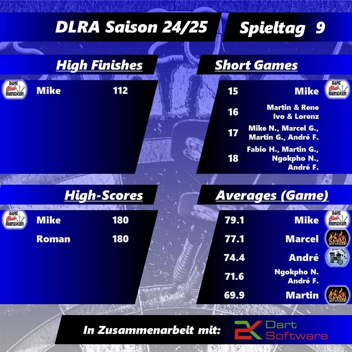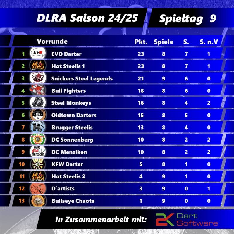 Das Darts-Jahr 2024 ist zu Ende - zumindest in der DLRA. Am 9. Spieltag der Saison 24/25 war von zwei klaren 9:1-Siegen bis zu einem knappen 6:5 nach Verlängerung alles dabei. In der Tabelle liegen nach wie vor die EVO Darter - punktgleich mit den Hot Steelis 1 - an der Spitze. Letzteren gelang es, das Jahr 2024 ohne eine einzige Niederlage abzuschliessen. Gratulation!