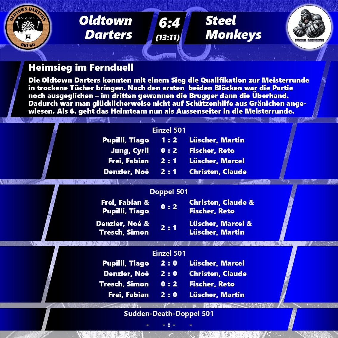 Die Vorrunde der Saison 24/25 ist zu Ende und die Plätze sind vergeben. Im Fernduell um den letzten Platz in der Meisterrunde setzten sich die Oldtown Darters dank einem Heimsieg durch. Dieser war nötig, denn auch die Brugger Steelis gewannen ihr letztes Spiel.