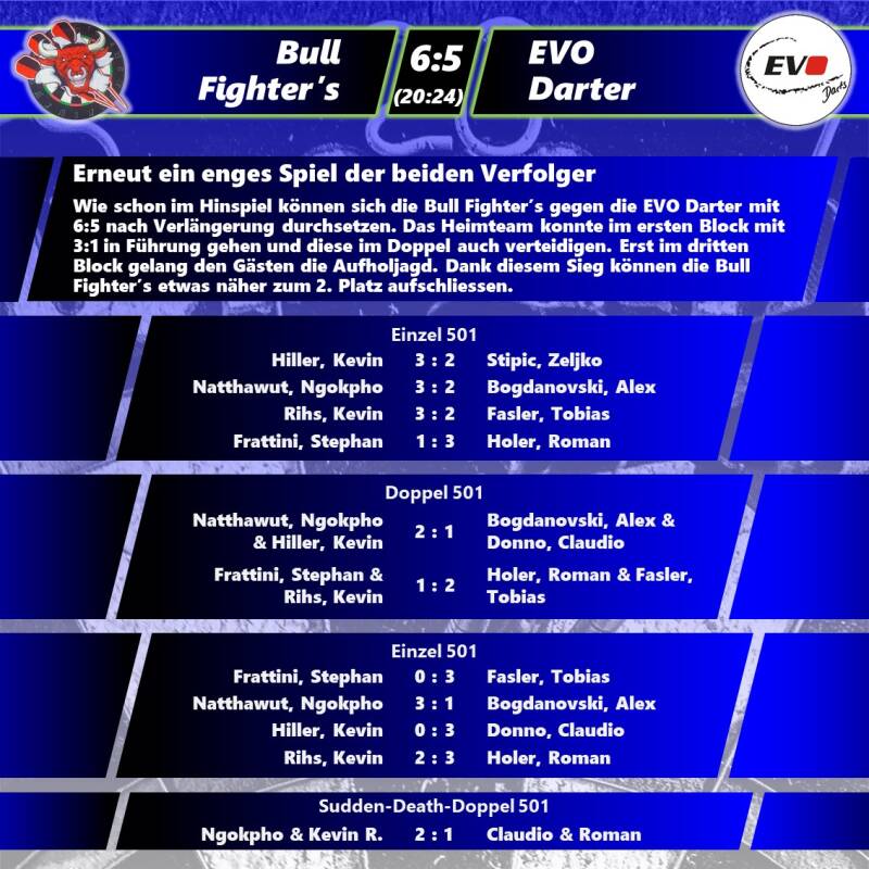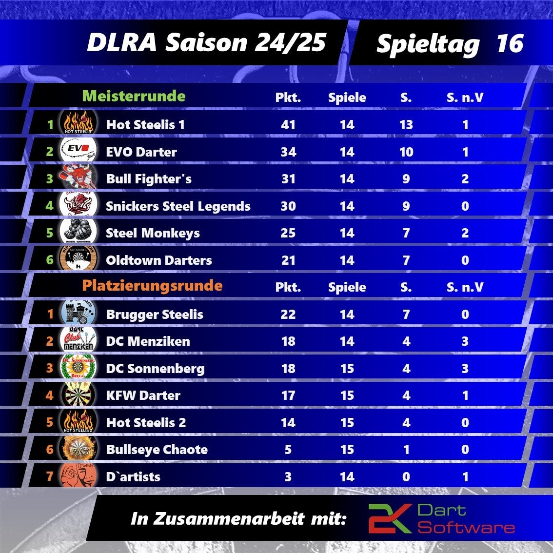 Auch nach der 16. Runde bleibt es spannend: Die Punkteteilung im Verfolger-Duell zwischen den Bull Fighter's und den EVO Dartern führt zu einem Zusammenschluss der Teams. Die Bull Fighter's rücken etwas näher zu den EVO Dartern auf und die Snickers Steel Legends wiederum näher zu den Bull Fighter's.