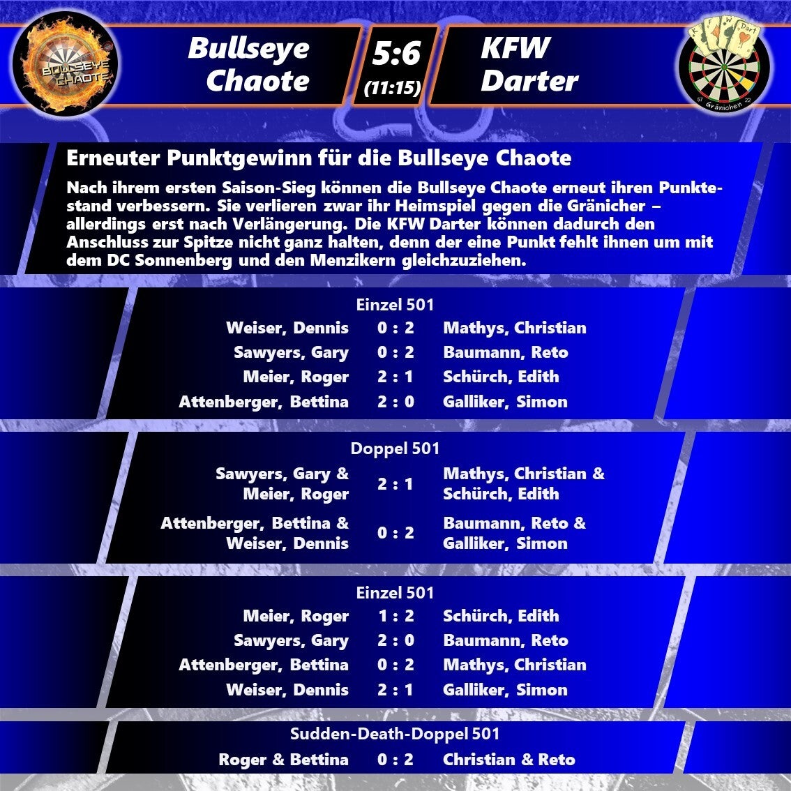 Ähnlich sieht es auch in der Platzierungsrunde aus. Dort liegen der DC Menziken und der DC Sonnenberg punktgleich auf den Plätzen 2 und 3 - während die KFW Darter mit nur einem Punkt Rückstand dahinter lauern.